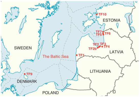 Figure 1. Map of the Baltic Sea region indicating the locations of the analyzed wild Trifolium fragiferum populations. TF1 to TF10 indicate different populations.