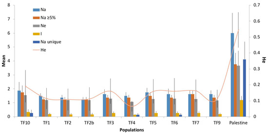 Figure 2. Genetic diversity parameters (mean over all loci) of the analyzed T. fragiferum populations. Na—number of alleles, Na ≥ 5%—number of alleles with a frequency equal to or more than 5%, Ne—effective number of alleles, I—information index, Na unique—number of unique alleles in each population, and He—expected heterozygosity.