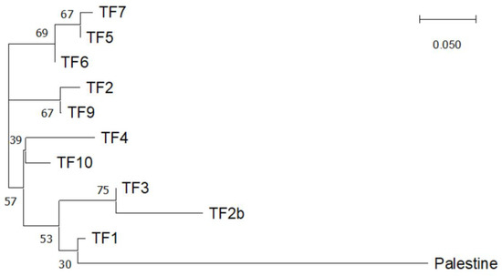 Genetic differentiation of the analyzed populations was high; overall, FST was 0.380 (p < 0.001). Removing individuals from the highly polymorphic and differentiated variety ‘Palestine’ from analysis did not have a large impact on the overall FST between the remaining populations, which was 0.375 (p < 0.001). This differentiation was mainly due to the locus TPSSR40. Pairwise population FST values were above 0.05, with the exception of TF5–TF6 (0.038), TF5–TF7 (0.017), and TF6–TF7 (0.007) (Table 1). Unique (private) alleles were identified for the cv. ‘Palestine’ at all loci, at frequencies ranging from 0.021 to 0.583. Private alleles were also found in the population TF10 (TPSSR40, 2 alleles, f = 0.130, and 0.413), as well as the population TF4 (TPSSR40, f = 0.021), and TF6 (TPSSR16, f = 0.042).