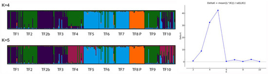 The differentiation of the cultivar ‘Palestine’ and the clustering of the populations TF5, TF6, and TF7 can be observed in the neighbor-joining dendrogram based on pairwise Nei genetic distances (Figure 3). Using the ΔK method, the analysis of the Structure software results indicated that the most likely number of clusters was K = 5, with K = 4 also having a high ΔK value (Figure 4). Structure analysis also indicated that the cv. ‘Palestine’ was highly differentiated from the other populations. Populations TF5, TF6, and TF7 were clustered together, which also corresponded to their close geographical proximity (Figure 1). Interestingly, despite their close geographical proximity, the populations TF2, TF2B, TF3 and TF4 were differentiated, which may be a reflection of the dispersal mechanisms of T. fragiferum, and the differing provenances of the founders of these populations. The populations TF9 and TF10 (from Denmark and Estonia, respectively), were not highly differentiated from the Latvian populations. Again, this could be a consequence of the dispersal mechanisms of this species, or alternatively, a result of the low genetic diversity revealed using the SSR markers.