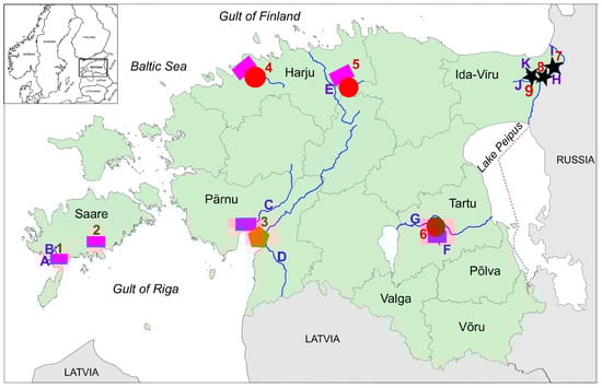 Description of the sampled locations in Estonia. Location numbers and capital letters in brackets correspond to those in Figure 1.
