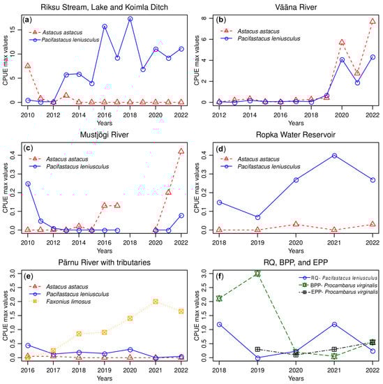 Changes in relative crayfish abundance (CPUE max) of NICS and Astacus astacus (noble crayfish) or NICS during the years at different sampling locations. (a) CPUE max in Riksu Stream; (b) CPUE max in Vääna River; (c) CPUE max in Mustjõgi River; (d) CPUE max in Ropka Water Reservoir; (e) CPUE max in Pärnu River; (f) CPUE max in Reo Quarry (RQ), Baltic Power Plant outlet (BPP), and Estonian Power Plant outlet (EPP).