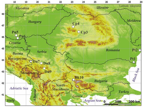 Location of the sites where the relevés considered in this study were performed. The group of letters and numbers within the labels refer to the identity of the region and study site, respectively. Pt = Pontic; Cp = Carpathian, Pn = Pannonian; Dn = Dinaric; Bk = Balkan; 1—Cotu Văii; 2—Enisala; 3—Trascău Mts.; 4—Meseș piedmonts; 5—Mecsek Hills; 6—Villány Hills; 7—Tara Mt.; 8—Suvobor Mt.; 9—Goč and Kopaonik Mts.; 10—Vitosha Mt.