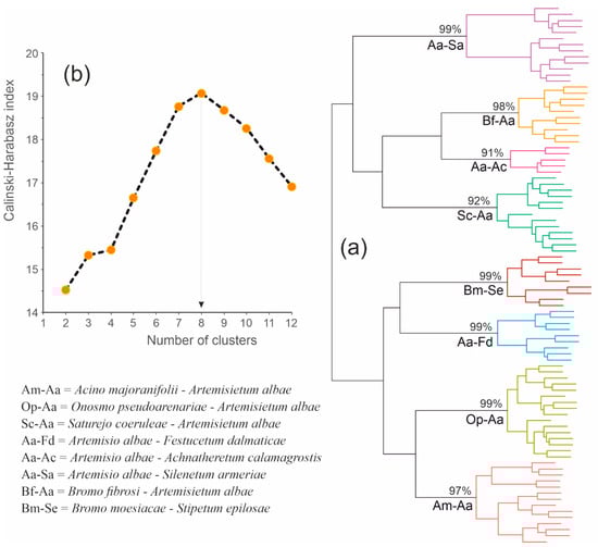 The distribution of the Calinski–Harabasz index by cluster number points to an optimal classification of the 89 relevés in eight clusters, each of them showing a high stability, i.e., over 90% (Figure 2). All relevés pertaining to the five plant associations previously described in neighbouring regions were joined separately in five clusters, whereas the relevés performed in the Apuseni Mountains and Dobrogea (Romania) were grouped into the other three clusters. The two largest clusters produced a clear separation between the Artemisia alba communities from the inner continental zone (containing, among others, the Carpathian, Pannonian and central Balkan regions) and those from its external margins (including the Pontic and Dinaric regions).