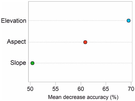 The ranking of topographic predictors in terms of their importance in classifying the 89 relevés in the eight distinguished plant associations shows that elevation has the highest mean decrease accuracy (Figure 3). The predictive power of all the topographic variables taken together is rather good, since the classification error rate of the corresponding Random Forest model is 13.48%.