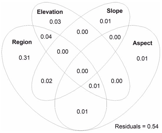 The partition of variance in species composition among all predictors revealed a relatively large contribution of ‘Region’ and much lower importance of topographic variables (Figure 4). Among the latter, elevation has a contribution three times higher than slope and aspect. About 46% of the total variance is explained by all predictors based on their linear combination.