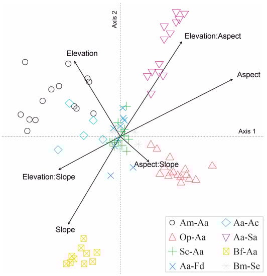 Following the forward selection of environmental predictors that should partly explain the variation in species composition, while controlling for the relevé grouping in different regions, all topographic variables in hand show significant but no singular effects, because of their interactions (Table 7). The topographically constrained and spatially conditioned ordination of relevés reveals a more or less sharp distinction of communities assigned to different associations, except for the relevés of Sc-Aa, Aa-Fd and Bm-Se that are intermixed and display low scores on both axes (Figure 5). The Aa-Sa coenoses appear as the sunniest compared to all the others, whereas the Bf-Aa communities are separately grouped at the positive end of the slope gradient. No consistent patterns with respect to the altitudinal gradient are reflected in the disposal of relevés in the ordination space.