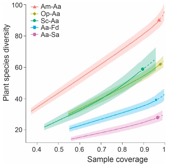 Given the large difference in relevé size (10 to 100 m2), the comparison of plant species diversity between syntaxa was based on sample completeness [] and involved only five (out of eight) plant associations, which were represented through sampling plots of 10 to 25 m2. Species diversity was estimated through the Hill’s number equivalent of order 1 (exponential Shannon entropy), which weights the rare and common species equally, and is less sensitive than species richness to sampling effects [,]. An equal sample size of 25 plots was simulated to extend the rarefied diversity curves through extrapolation, so that the sample coverage (completeness) estimated through species incidence would reach over 0.95 in each of the five community types compared.