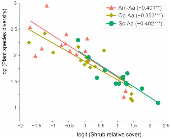 The observed decline in overall species diversity with increasing shrub relative cover in each of the three communities (Am-Aa, Op-Aa and Sc-Aa) closely matches the global pattern of woody encroachment in dry grasslands [,,]. This suggests that these dwarf scrub communities may have originated successionally from open, steppe-like grasslands, possibly as a result of release from livestock grazing [,]. Although not direct evidence, the negative effect of shrub relative abundance on local species diversity is in accordance with the refined stress gradient hypothesis, according to which asymmetric competition is driven by resource-based (e.g., water) stress [,].