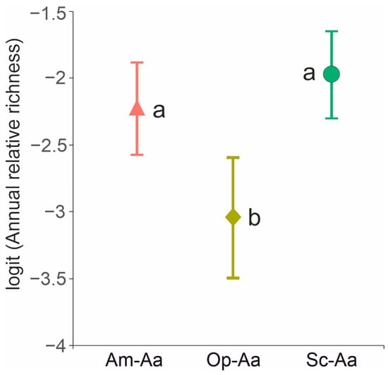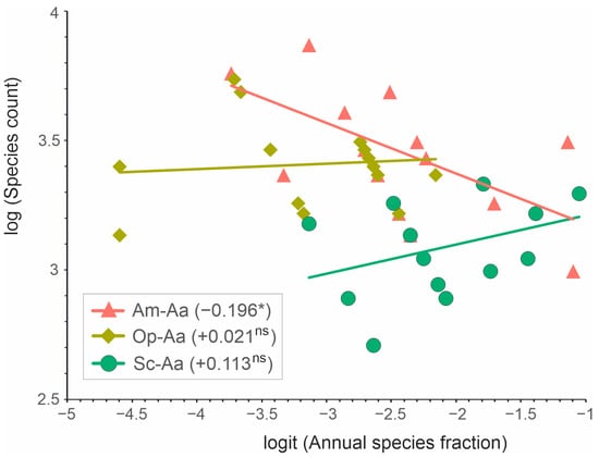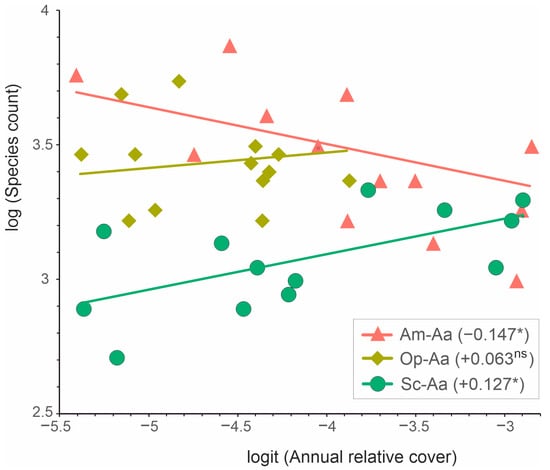 A significant increase in species richness with increasing annual relative cover is only noticeable in Sc-Aa (Figure 10). In contrast, a significant decrease is observed in Am-Aa, whereas in Op-Aa the positive slope of the regression line is not significantly different from null (Figure 10).