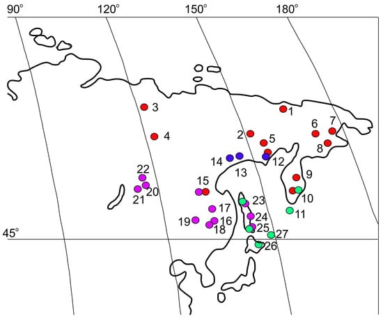 Distribution of Kolhymamnicola snails. Blue circles—K. ochotica, red—K. kolhymensis, violet—K. wasiliewae, green—K. miyadii. (1) Lower Kolhyma River basin, near Chersky settlement, 68°44′ N 161°21′ E (type locality). (2) Middle Kolhyma River basin, nameless floodplain-thermokarst lake, 66°39′ N 152°35′ E. (3) Lower Lena River basin, 67°49′ N 123°06′ E. (4) Lower Lena River basin, near the confluence of the Vilyui River, 64°27′ N 126°06′ E. (5) Middle Kolhyma River basin, Lake Priyatnoe, 62°07′ N 149°05′ E. (6) Chukotka, Anadyr River basin, nameless floodplain lakes (Nos. 5, 6) 64°59′ N 171°26′ E. (7) Chukotka, Avtotkui River basin, small floodplain lake, near Anadyr city, 64°43′ N 177°31′ E. (8) Chukotka, Khatyrka River basin, Lake Rybnoe, 62°03′ N 175°16′ E. (9) Kamchatka, Lake Azabachye, 56°08′ N 161°47′ E. (10) Kamchatka, Lake Turpanka 52°56′ N 158°24′ E. (11) Kuril Islands, Shumshu Island, Lake Bolshoye, 50°45′ N 156°15′ E (type locality). (12) Coast of the Okhotsk sea, Perevolochnaya Bay, Yama River valley, nameless lake, 59°43′ N 149°46′ E. (13) Tynerynda lake 59°46′ N 149°23′ E; Kava River basin, coast of the Okhotsk sea, 59°38′ N 149°05′ E; Kava River basin, Sbornoe lake, 59°37′ N 147°07′ E. (14) Okhota River basin, lake Bolshoe Uyeginskoe, 59°20′ N 143°01′ E (type locality) (15) Upper Zeya River basin, 50°14′ N 127°34′ E. (16) Lower Amur River basin, Bolin River (backwater), vicinity of Amursk, 50°19′ N 136°48′ E (type locality). (17) Amgun River basin, Chukchagirskoye Lake, 51°57′ N 136°31′ E. (18) Bolshoy In River, tributary of Tunguska River, 48°36′ N 133°39′ E. (19) Middle Bureya River basin, 49°26′ N 129°30′ E. (20) Leprindo Lake, 56°37′ N 117°31′ E. (21) Tsypa Lake 54°50′ N 112°25′ E. (22) vicinity of the Vitimsky Nature Reserve, lake in the Lapagar terrain, 57°15′ N 116°24′ E. (23) Sakhalin Island (north part), lake connected to a tributary of Val River, 52°21′ N 143°04′ E; Tym River basin, flowing lake, and oxbow lake of the Tym River 51°39′ N 142°56′ E and near: floodplain lake near Tymovski settlement (24,25) channel between Ayskoye and Baklaniye lakes, 46°36′ N 143°18′ E; pond, connected with Lake Bolshoye Vavayskoye, 46°36′ N 143°18′ E. (26) Kunashir Island, Yuzhno-Kurilsk, Serebryanka River and Serebryanka lake, 44°02′ N 145°51′ E. (27) Zelyeniy Island, Lake Sredneye, 43°29′ N 146°08′ E.