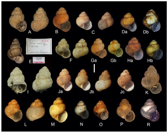 - Szarowska, M. Molecular phylogeny, systematics and morphological character evolution in the Balkan Rissooidea (Caenogastropoda). Folia Malacol. 2006, 14, 99–168. [Google Scholar] [CrossRef]