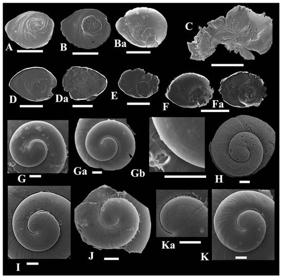 Protoconch slightly spiral sculptured or smooth, with a few thin spiral lines visible mainly near suture, whorl number from 1.25 to 1.5, diameter 520–780 µm, initial plate ~140–190 µm (n = 8) (Figure 3G–K).