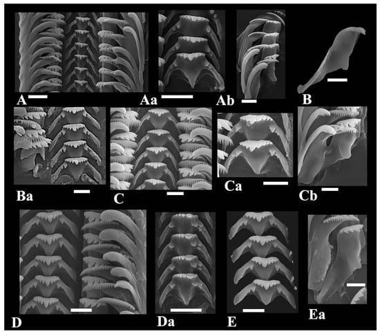 Radular teeth of Kolhymamnicola species. (A,Aa,Ab) K. wasiliewae, IBSS, leg. L. Prozorova, (B,Ba) K. kolhymensis, IBSS, No.2120b. (C,Ca,Cb) K. ochotica, IBSS, No. 4325. (D,E) K. miyadii, IBSS, No. 111-97. Scale bars 10 μm.