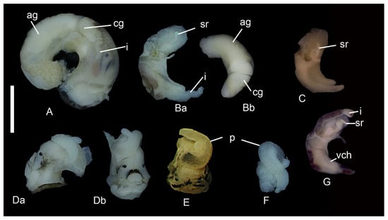 Soft bodies of Kolhymamnicola. (A) K. miyadii, female, the whole body, right side (shell, see Figure 1Ha). (Ba) K. miyadii, the same specimen, gonoduct, ventral view. (Bb) the same specimen, gonoduct, dorsal view. (C) K. ochotica, female gonoduct (shell, see Figure 1K); (Da,Db) K. miyadii, male (shell, see Figure 1Hb), the front part of the body with penis; (Da) the left side; (Db) frontal view; (E) K. miyadii, male, the front part of the body with penis (shell, see Figure 1Gb); (F) K. cf. wasiliewae, penis (shell, see Figure 1P); (G). K. cf. wasiliewae, female gonoduct (shell, see Figure 1R). Scale bars 1 mm. Abbreviations: ag—albumen gland, cg—capsule gland, i—intestine, p—penis, sr—seminal receptacle, vch—ventral channel.