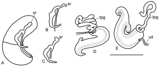 Drawings of reproductive organs of Kolhymamnicola. (A) Female gonoduct of K. kolhymensis. (B) a seminal receptacle of K. ochotica. (C) a seminal receptacle of K miyadii from Zelenyi isl., IBSS, No. 518 (D,E) penises of K. cf. miyadii (after Prozorova, original). Scale bars 1 mm. Abbreviations: sr—seminal receptacle, tpg—tubular penial gland, vd—vas deference.