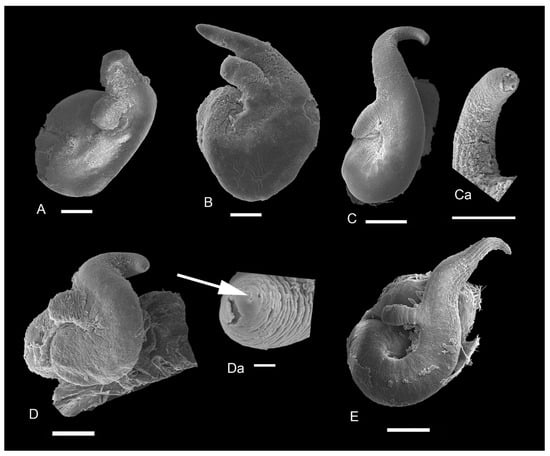 SEM photographs of penises of Kolhymamnicola. (A) K. kolhymensis from Perevolochnaya Valley, IBSS, No. 2120b. (B) K. ochotica from Kava River basin, IBSS, No. 4325. (C) K. wasiliewae from Bol’shoi Bolin River basin, IBSS, leg. L. Prozorova. (Ca) increasing tip of the penis; (D) K. miyadii from Zelenyi Island, IBSS, No. 518. (Da) increasing tip of the penis; (E) K. miyadii from Shumshu Island (shell, see Figure 1Gb). Scale bars: (A,B,D,E) 100 μm; (Ca) 50 μm, (Da) 10 μm.