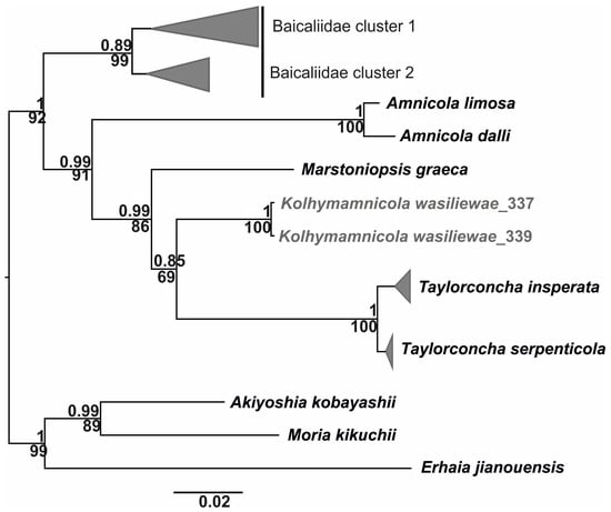 The obtained phylogenetic tree based on combined nucleotide sequences for COI, 16S, and 18S gene fragments consists of two highly supported clades, one of them includes Kolhymamnicola, the North American genera Taylorconcha and Amnicola, as well the European Marstoniopsis. The Baicaliidae are paraphyletic in relation to this clade. Another clade comprises the Far East genus Akiyoshia and the Southern Asian genera Moria and Erhaia, the genetic distance between them was 0.099.