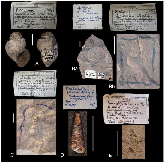 Some fossil representatives of ‘Bithyniidae’, Palaeobaicaliidae, and Baicaliidae with their museum labels. (A) Bythinia leachioides Martinson, 1961, holotype. (Ba,Bb) Bythinia jurassica Martinson, 1961, holotype. (Ba) Deposit with shell imprint. (Bb) the same, enlarged. (C) Palaeobaicalia pumila Martinson, 1961, holotype, the type species of the genus. (D) Probaicalia gerassimovi (Reis, 1910), topotype. (E) ‘Baicalia’ wresniowskioides (Martinson, 1951). Scale bars 5 mm.