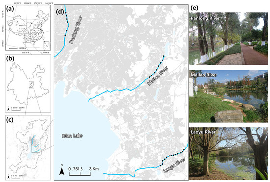 Location of the 28 sampling sites among three rivers with different levels of human disturbance along the urban development gradient in Kunming, Yunnan Province, China (the Panlong River—high-human disturbance rivers; the Maliao River—medium-human disturbance rivers; the Laoyu River—low-human disturbance rivers). (a) The location of Yunnan Province in China. (b) The location of the main urban area (the six administrative districts) of Kunming surrounding Dianchi Lake. (c) The three rivers with different levels of human disturbance along the urban development gradient in Kunming. (d) The location of the 28 sampling sites. The sampling sites we selected were located in the typical green space along each river. (e) Pictures of the typical habitat types in each river.