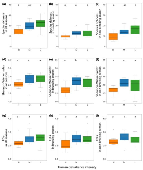 Throughout the year and the non-breeding season of birds, the Shannon–Wiener index showed no significant difference. However, in the breeding season, low- and medium-human disturbance rivers had a significantly higher Shannon–Wiener index than the high-human disturbance river (p = 0.006, p = 0.009). There was no significant difference in FDis among the three types of rivers during the annual cycle, the breeding or non-breeding season.