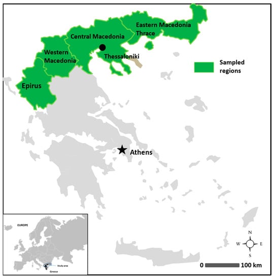The study was carried out in four administrative regions of north Greece: Epirus, Western Macedonia, Central Macedonia, Eastern Macedonia and Thrace (Figure 1), with a population of about 3,110,000 inhabitants in 1,183,010 households [59]. Although hedgehogs are found throughout most of Greece, we chose areas closer to our department (Drama, Western Macedonia) for logistical reasons. Data were collected through on-site face-to-face questionnaire surveys, between April and June 2019. A pretest of the survey (n = 30 random people) was conducted to test question clarity and completion time. During the main survey, cities, towns, and villages in all the regions, was visited during open market hours (9.00–15.00 and 17.00–21.00, from Monday to Saturday). People in most neighborhoods were surveyed, representing areas of different socioeconomic status. The researcher (D.C.) asked every fifth person passing in front of her to participate in the survey by reading and responding to questions in the questionnaire (respondent-completed survey; [60]). The researcher provided help to the respondent when necessary. In cases in which more than five persons had passed before the completion of a survey, the researcher asked the first person that she came across to participate. The participants needed about 45 min to complete the survey.