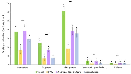 Mean abundance (±SE) of nematode trophic groups (individuals/100 gr dry soil), 30 days after application of treatments. Different letters (a, b, and c) indicate statistically significant differences between treatments revealed by one-way ANOVA and LSD test. (**, p < 0.01; ***, p < 0.001).