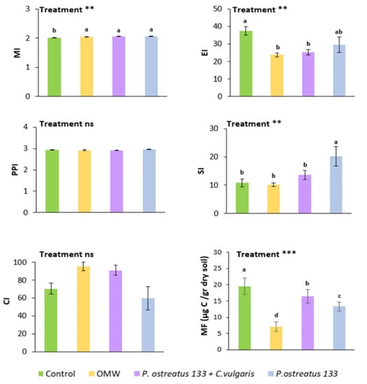 The response of nematode indices to treatments is depicted in Figure 2. The maturity index (MI) was higher in all OMW treatments compared to the control, but did not vary among them. All OMW treatments resulted in lower values of the enrichment index (EI) and the metabolic footprint, but the result was more pronounced in the case of non-treated OMW. The highest values of the structure index were recorded in samples with P. ostreatus AMRL 133-treated OMW. The other treatments did not differ significantly concerning the SI values.