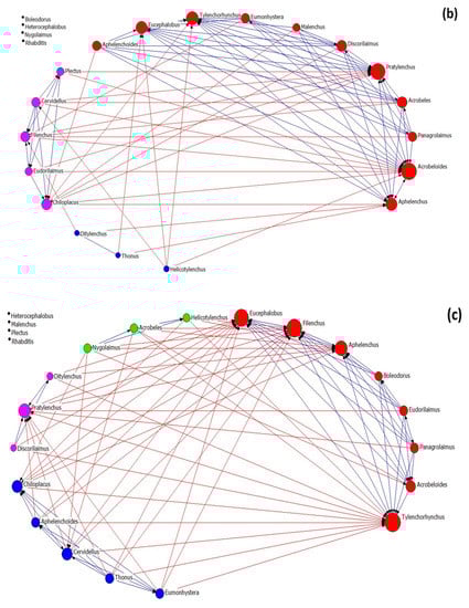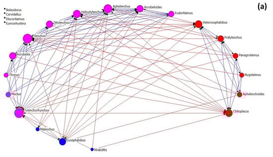 Network analysis aims to represent and quantify structures, borrowing metrics from graph theory, a field of mathematics analyzing the patterns of relations among nodes []. In the present study, nodes stand for nematode genera, while the ties connecting these nodes represent the joint occurrence of genera in samples.