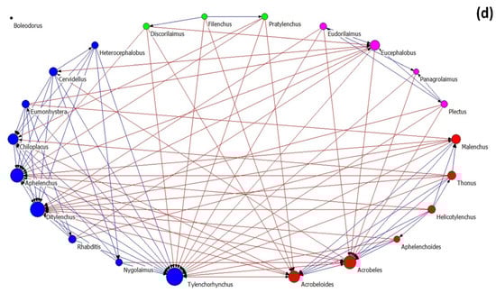 The network of interactions between nematode genera under different treatments: (a) control, (b) OMW, (c) P. ostreatus AMRL 133 + C. vulgaris, and (d) P. ostreatus AMRL 133. Nodes of different colors correspond to different factions. The higher the size of a node the higher its degree centrality value. Red-colored ties represent links between nodes of different factions, while blue-colored ties represent links between nodes of the same faction. Arrows indicate the direction of the relationship.