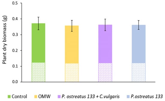 Our results showed that none of our treatments significantly affected plant biomass at the end of the sampling period. Similar findings were reported by Vouyoukalou and Stefanoudaki [] regarding the fresh plant weight in an 80 d plant experiment. Other studies have reported that using OMW as a fertilizer enhanced plant growth but at lower levels than that under conventional fertilizer and potable water [,]. On the contrary, Aggelis et al. [] observed a decrease in lettuce yields after non-treated OMW irrigation, due to the elevated EC values found in the soils, which caused difficulties in the water and nutrient uptake by the plants []. However, OMW dilutions at a greater level minimized the decrease in lettuce yields. In our study, plants of Lactuca sativa in pots with 10% diluted non-treated OMW showed a delay in plant development the first seven days after treatment application. However, after 30 days, the final dry biomass values did not differ significantly between the treatments at the end of the experiment. One possible reason is that adverse effects may disappear with time due to the degradation of phenolic compounds []. Furthermore, the fact that the soil used in the present study was degraded, combined with the high C/N of wastes in all treatments, must be considered with regard to plant growth. At an elevated C/N ratio, soil nitrogen becomes immobilized and unavailable to plants undergoing stress.