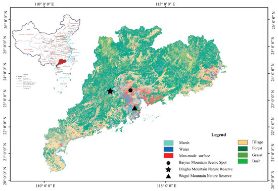 Study sampling areas in Guangdong Province in South China. Modified from http://211.159.153.75/index.html (accessed on 20 July 2022) and National Earth System Science Data Center https://www.geodata.cn/index.html (accessed on 20 July 2022).