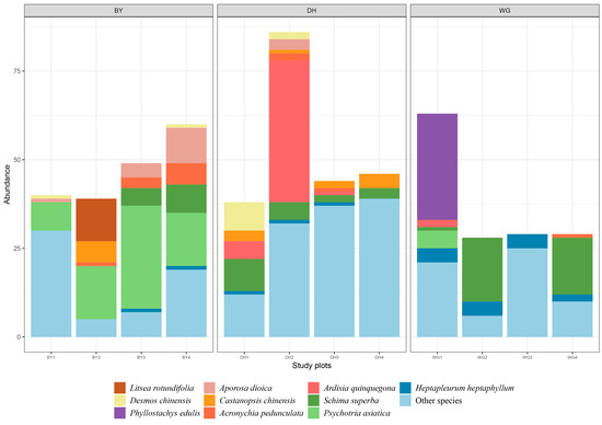 Tree abundance at the species level across 12 sample plots. BY1, BY2, BY3, and BY4 represent the Baiyun Mountain Scenic Spot (BY) sample sites. DH1, DH2, DH3, and DH4 represent the Dinghu Mountain Nature Reserve (DH) sample sites and WG1, WG2, and WG3 represent the Wugui Mountain Nature Reserve (WG) sample sites. The top 10 species are shown, with all other species designated as “Other species”. Different colors correspond to different species.