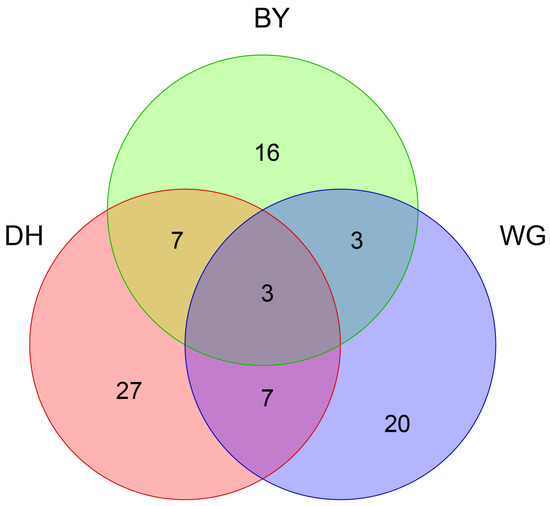 Venn diagram showing exclusive and shared tree species across the three study areas. BY represents Baiyun Mountain Scenic Spot sample sites, while DH indicates Dinghu Mountain Nature Reserve sample sites and WG represents Wugui Mountain Nature Reserve sample sites. Numbers represent the numbers of tree species.