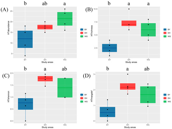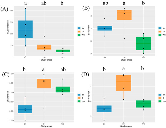 Diversity index box plots for host trees in the three study areas. (A) Abundance of host trees; (B) Richness of host trees; (C) Shannon index of host trees; (D) Margalef index of host trees. Study sites are indicated by different colors, while different letters denote significant differences between study sites (Tukey’s HSD test, p < 0.05). Data that did not conform to the ANOVA criteria were analyzed with Kruskal–Wallis tests.