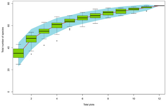 Species accumulation curve corresponding to total Scolytinae beetle species richness across the 12 sampling plots. “+” denoted the point beyond the 95% confidence interval.