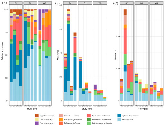 Scolytinae beetle abundance at the species level in the 12 sampling plots. BY1, BY2, BY3, and BY4 represent Baiyun Mountain Scenic Spot (BY) sample sites. DH1, DH2, DH3, and DH4 represent Dinghu Mountain Nature Reserve (DH) sample sites and WG1, WG2, and WG3 represent Wugui Mountain Nature Reserve (WG) sample sites. The top 10 most abundant Scolytinae beetles are shown, while all others are designated as “Other species”. Different colors correspond to different species. (A) Relative abundance across both seasons. (B) Absolute abundance during the rainy season. (C) Absolute abundance during the dry season.