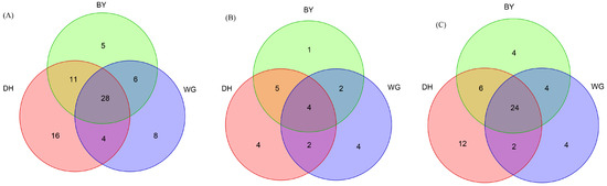 Venn diagrams showing shared and exclusive species in the three study areas. Numbers correspond to the number of detected species. BY represents the Baiyun Mountain Scenic Spot sample site. DH represents the Dinghu Mountain Nature Reserve sample site and WG represents the Wugui Mountain Nature Reserve sample site. (A) Exclusive and shared Scolytinae species in the three study areas. (B) Exclusive and shared bark beetle species in the three study areas. (C) Exclusive and shared ambrosia beetle species in the three study areas.