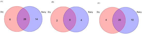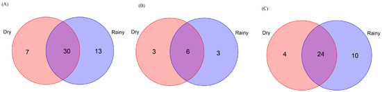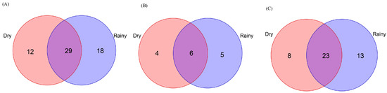 Venn diagrams showing shared and exclusive species from the Baiyun Mountain Scenic Spot. Numbers correspond to the number of identified species. (A) Exclusive and shared Scolytinae species in the rainy and dry seasons. (B) Exclusive and shared bark beetle species in the rainy and dry seasons. (C) Exclusive and shared ambrosia beetle species in the rainy and dry seasons.