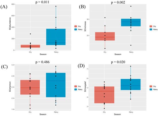 Diversity indices, including species abundance, species richness, and the Margalef richness index, were significantly higher during the rainy season, relative to the dry season, at all study sites, whereas the Shannon–Wiener diversity index did not exhibit any significant seasonal variations (Figure 12).