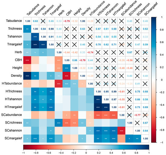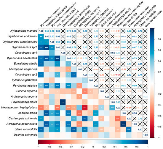 Heatmap depicting the relationships between dominant plants and dominant Scolytinae beetles, analyzed by Pearson’s correlation analyses. Correlation coefficients are shown in individual squares, with a black “X” denoting a lack of any correlation. Red and blue are, respectively, used to depict negative and positive correlations. “*” indicated p < 0.05, “**” indicated p < 0.01, and “***” indicated p < 0.001. p < 0.05, p < 0.01, and p < 0.001, respectively, denote low, moderate, and high correlation strength.