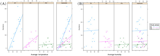 Covariance analyses of the relationships between climatic factors and Scolytinae beetle abundance. (A) Relationships between average temperature and Scolytinae beetle abundance. (B) Relationships between average relative humidity and Scolytinae beetle abundance.