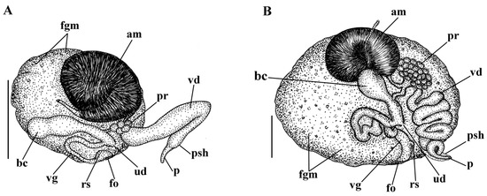 Reproductive systems of Dendronotus keatleyae n. sp. (A) and Dendronotus arcticus gartensis n. subsp. (B); Abbreviations: am, ampulla; bc, bursa copulatrix; fgm, female gland mass; fo, female opening; p, penis (=copulatory organ); pr, prostate; psh, penial sheath; rs, receptaculum seminis; ud, uterine duct; vd, vas deferens; vg, vaginal duct. Scale bars: 1 mm.