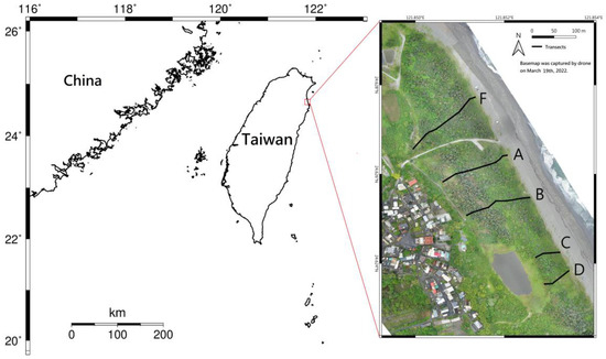 Dakenggu coastal forest is an artificial coastal forest without long-term monitoring data. According to the local residents, this forest was created by the Taiwanese government through afforestation over a large dune in this area approximately 30 years ago. This artificial coastal forest was created to prevent the coastline from retreating, the dunes from disappearing, and the northeast monsoon and typhoon from considerably affecting the area. Few coastal forest surveys have been conducted in this area. Only one publication has thus far reported on the vegetation in the Dakenggu coastal forest, but it mainly focused on seedling planting experiments on the north side [19]; it only indicated that pure Casuarina equisetifolia afforestation was performed in coastal forests in this district between 1977 and 1986. Coastal windbreaks cannot easily replace C. equisetifolia, which is a tree species that exhibits the tallest growth and greatest wind resistance compared to other coastal tree species. Because of the morphological characteristics of C. equisetifolia, including the high salt resistance of its cytoplasm, it has high drought and salt tolerance [20,21,22,23,24]. However, two pieces of documentation from 1977 and 1986 do not record information such as the area, scope, and quantity of planting [19]. Therefore, the current study is the largest survey of the Dakenggu coastal forest in Suao, Yilan, that discusses the successive afforestation or reforestation conditions over the past 40 years and investigates the composition of coastal forests and the gap (grass area) of coastal forests. Due to the lack of clear information on Dakenggu coastal forest, two of our aims in this study were (1) use a drone survey to understand the composition of the coastal forest; (2) use transects and tree tally to understand the differences in the diameter at breast height and height among each transect.