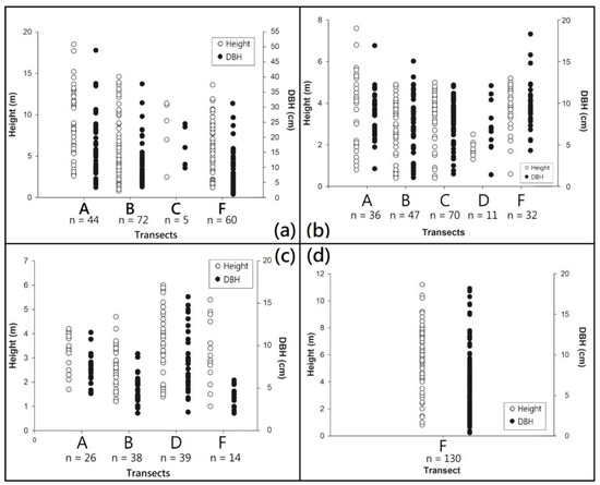 Because the area covered by H. tiliaceus in the southern coastal forest was small and fragmented, no H. tiliaceus was recorded in transects A, B, C, and D. According to our survey results, transect F in the northern coastal forest demonstrated a large, continuous area with H. tiliaceus. Elevitch and Thomson [37] indicate that the height of H. tiliaceus is 3–10 m, which is consistent with our result. Because only transect F demonstrated the presence of H. tiliaceus, relevant comparisons among transects could not be made, and only the regression relationship between tree height and DBH was obtained.