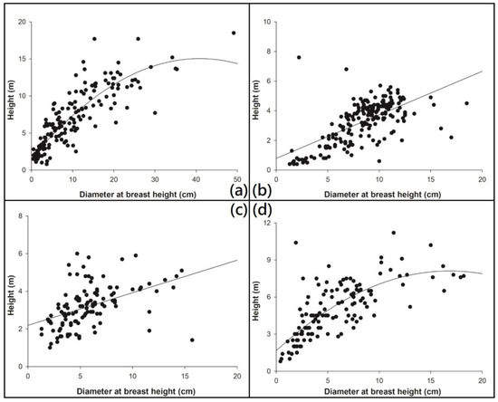 Regression analysis of DBH versus tree height. (a) Polynomial regression of C. equisetifolia (p < 0.001). (b) Linear regression of P. tectorius (p < 0.001). (c) Linear regression of Ce. manghas (p < 0.001). (d) Polynomial regression of H. tiliaceus (p < 0.001).