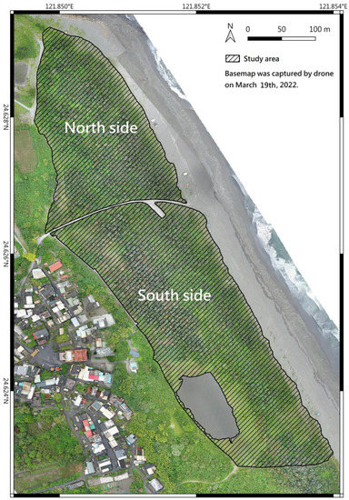 In this study, the Dakenggu coastal forest was divided into two areas based on vehicle access: the northern and southern coastal forests (Figure 4). The total area of the coastal forest investigated in this study was 113,676.14 m2, with the areas of the north and the south coastal forests being 42,000.78 and 71,675.36 m2, respectively (i.e., 36.9% and 63.1% of the total area, respectively).