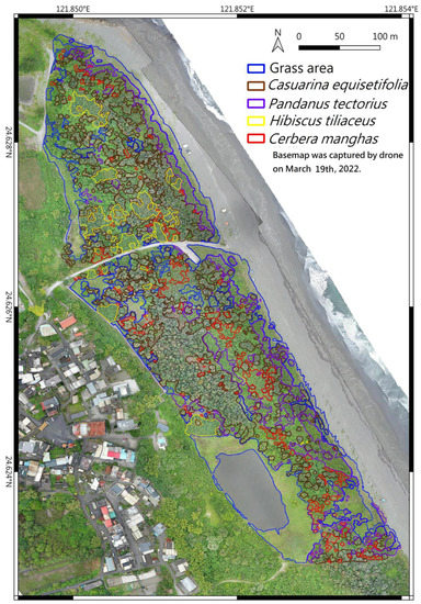 A drone (DJI Mavic 2 Pro) at a flight altitude of 60 m was used for the aerial photography of the coastal forest. The program DroneDeploy was used to automatically fly the drone and to obtain images. Next, we used Agisoft Metashape, a photo-editing software program, to analyse the composition of our aerial photographs and then used an AREY pro drawing tablet equipped with Photoshop 2021 to select and colorize tree species through manual identification: purple, brown, red, yellow, and blue were used to represent P. tectorius, C. equisetifolia, Ce. manghas, H. tiliaceus, and herbaceous voids, respectively. Subsequently, we used a geographic information system (GIS) (i.e., QGIS version 3.24.0) to analyse different areas. Polygon circle selection in QGIS’s New Shapefile Layer function was used to draw the main planting tree species range, followed by the use of QGIS’s Field Calculation function on the table properties to calculate the area of each tree species (m2) using a coordinate system.