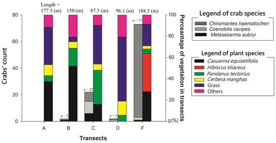 The land crab survey was performed in the same transects as the vegetation survey (Figure 6); we noted that the main land crab species in the coastal forest were Chiromantes haematocheir, Coenobita cavipes, and Metasesarma aubryi. Of these, Ch. haematocheir was the most abundant in transect F. In total, 99 individuals were found over the five survey months, followed by seven in transect C. Moreover, we found six M. aubryi and nine Co. cavipes individuals in transect C. However, we did not observe many crabs in transects A, B, and D; no crabs were recorded in transect A over the five survey months. In other words, the number of individual land crabs in transects A, B, and D was deficient. Moreover, we should note that only transect F had H. tiliaceus. In contrast to transects B and F, transects A, C, and D have high percentages of grass coverage that are over 35% (Figure 6). Transect B had the highest coverage of C. equisetifolia at 52% (Figure 6).