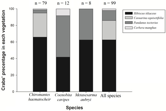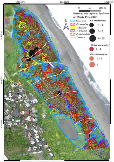 Figure 7 shows that most crab individuals (62.6%) were found under H. tiliaceus. A total of 65.8% of Ch. haematocheir individuals were found under H. tiliaceus, and 21.1% of individuals were found under C. equisetifolia. Regarding Co. cavipes, 50% of individuals were found under P. tectorius, and 41.7% were found under H. tiliaceus. Regarding Metasesarma aubryi, 62.5% of individuals were found under H. tiliaceus, and 37.5% of individuals were found under P. tectorius. The land crabs’ distribution can be seen in Figure 8.